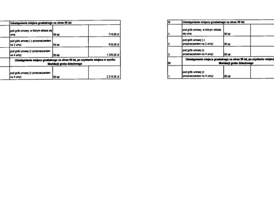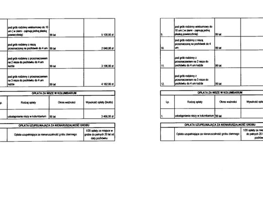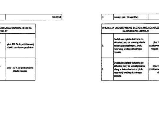 W uchwale proponuje się również wprowadzić możliwość nabycia miejsca grzebalnego lub niszy za życia w związku z tym wprowadza się opłaty za udostępnienie za życia miejsca grzebalnego na okres 20 lub 99 lat oraz niszy w kolumbarium. Polegać to ma na zawarciu umowy z Administratorem Cmentarzy Komunalnych oraz dokonaniu dodatkowej opłaty doliczanej do aktualnej ceny za udostępnienie miejsca grzebalnego z tytułu rezerwacji według aktualnego cennika plus 100 % do podstawowej stawki za miejsce grzebalne. Natomiast oplata za udostępnienie za życia niszy w kolumbarium stanowić ma dokonanie dodatkowej opłaty doliczanej do aktualnej ceny z tytułu rezerwacji według aktualnego cennika plus 150 % do podstawowej stawki za niszę. Udostępnienie za życia miejsc na cmentarzach komunalnych będzie następowało z uwzględnieniem konieczności zapewnienia odpowiedniej liczby miejsc do bieżących pochowań i nie może przekroczyć 20 % dostępnych nowo powstałych zgodnie z decyzją Administratora Cmentarzy lub powstałych w wyniku likwidacji miejsc grzebalnych Udostępniona za życia nisza w kolumbarium, miejsce grzebalne nie mogą być przedmiotem obrotu. Tym samym wprowadzony zostanie zakaz handlu miejscami grzebalnymi i nabywania znacznej ilości miejsc grzebalnych oraz nisz w kolumbarium.