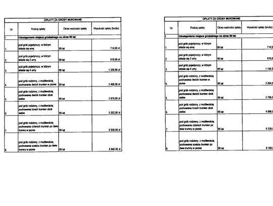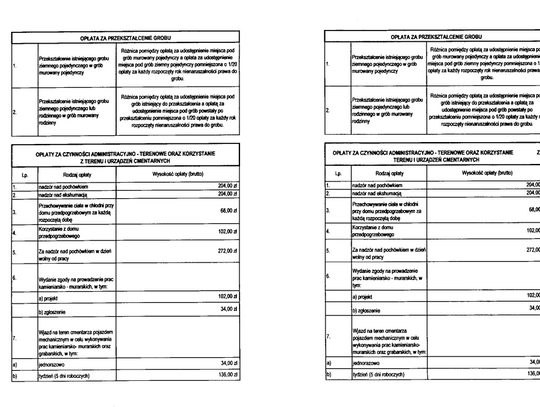 Na czwartkowej, ostatniej w tym roku, sesji Rady Miasta Włocławek radni zdecydują o wysokości opłat za korzystanie z cmentarzy i urządzeń cmentarnych Gminy Miasto Włocławek. Obecnie obowiązujące ceny zostały wprowadzone przez Radę Miasta 30 marca 2015 r. W uzasadnieniu czytamy, że opłaty zostały ustalone w związku z rzeczywistymi kosztami utrzymania cmentarza m.in w związku ze wzrostem opłat za energię czy wywóz śmieci. W stosownych tabelach podano nowy cennik, który mają zatwierdzić lub odrzucić radni (tabele zamieszczamy pod artykułem). Opłata za grób ziemny jednoosobowy lub rodzinny w którym składa się trumnę ze zwłokami na okres 20 lat miałaby wzrosnąć do 680 zł. Do tej pory ta sama usługa kosztowała 540 zł. Stawka jest jednakowa w tym przypadku dla cmentarza na Pińczacie oraz we Włocławku. Opłata za grób murowany rodzinny z możliwością pochowania dwóch trumien obok siebie - okres ważności opłaty 99 lat - wynieść miałaby 3 876,00 zł na cmentarzu we Włocławku. Na Pińczacie - 3 706,00. Do tej pory cena ta wynosi 2 592 zł. Nadzór nad pochówkiem i ekshumacją wzrósłby ze 108,00 zł do 204,00 zł. Opłata za pojedynczy grób w którym składa się urnę (99lat) - miałaby zgodnie z nowym cennikiem wynieść 714 zl - tyle samo w Pińczacie i we Włocławku. Udostępnienie niszy w kolumbarium na 99 lat - 3466,00 na cmentarzu we Włocławku i 2720,00 na Pińczacie. Do tej pory opłata ta wynosi 2160,00 zł.