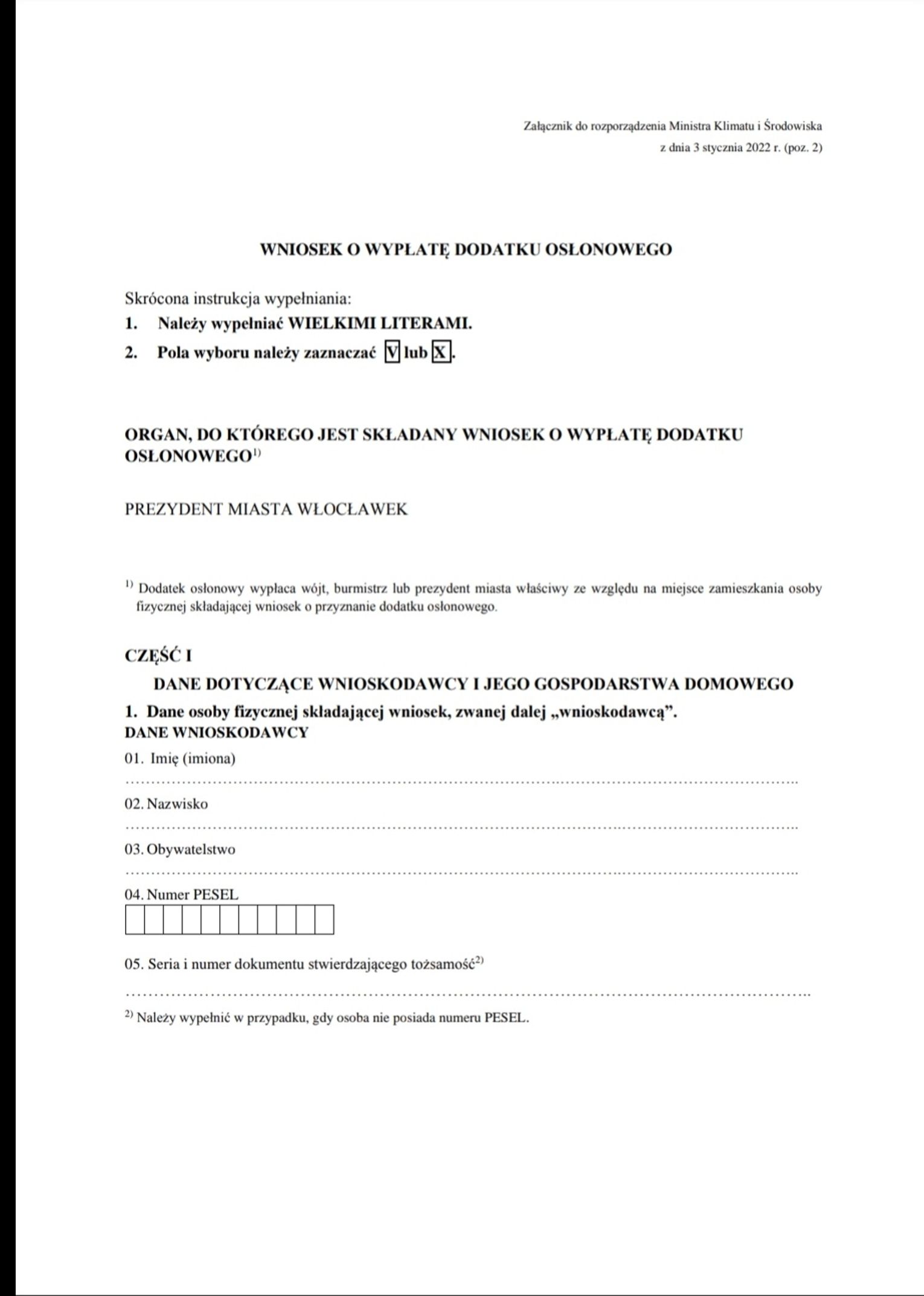 Na terenie miasta Włocławek zadanie realizowane będzie przez Miejski Ośrodek Pomocy Rodzinie we Włocławku, Sekcja Dodatków Mieszkaniowych, ul. Ogniowa 8/10, tel. 54 423 23 28, 54 423 23 27. Wypełnione wnioski można składać w MOPR lub za pomocą środków komunikacji elektronicznej (opatrzone kwalifikowanym podpisem elektronicznym lub uwierzytelnione z wykorzystaniem profilu zaufanego). Osoby, które złożą wniosek o przyznanie dodatku osłonowego do 31 stycznia 2022 roku, świadczenie otrzymają w dwóch ratach. Wypłata pierwszej nastąpi do 31 marca 2022 roku, a drugiej do 2 grudnia 2022 roku.