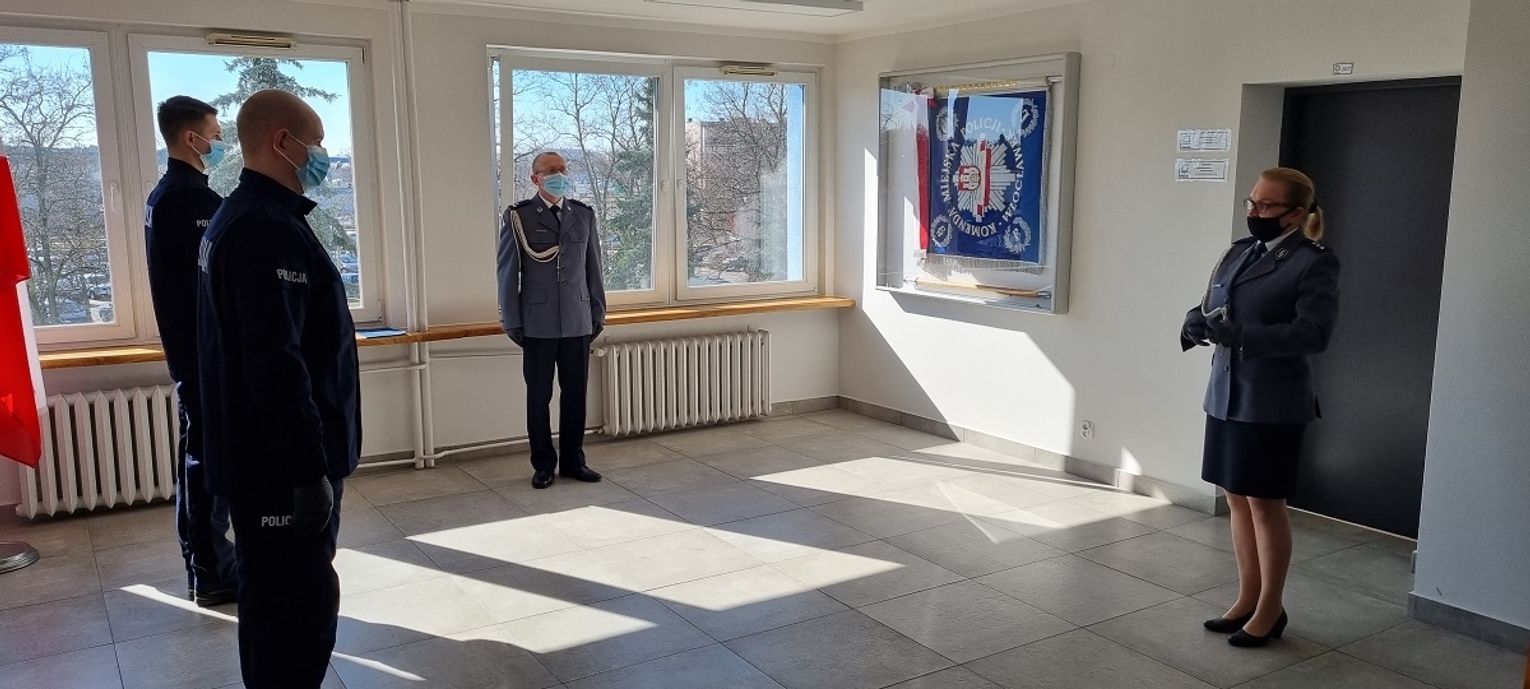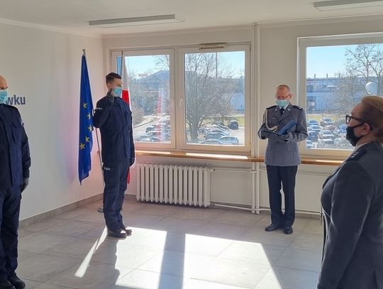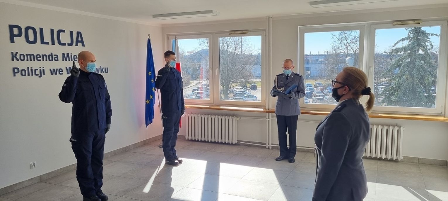 Dwóch nowo przyjętych policjantów zasiliło włocławską komendę. Złożyli ślubowanie, które przyjęła od nich pełniąca obowiązki Zastępcy Komendanta Miejskiego Policji we Włocławku kom. Izabela Ochmańska. Uroczystość miała miejsce dzisiaj (11.03.2022) we włocławskiej komendzie i rozpoczęła się od wypowiedzenia przez nowych policjantów słów roty ślubowania: