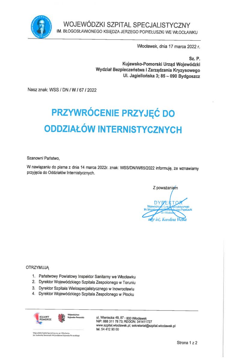 Szpital przywraca przyjęcia na oddziały internistyczne
