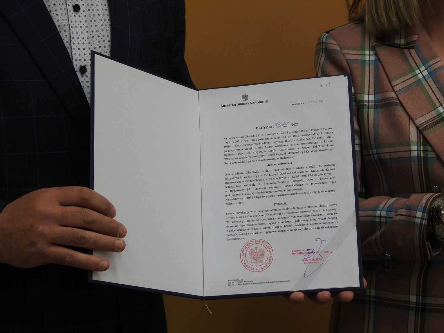 "Ten moment jest ważny dla Zespołu Szkół nr 4, bowiem dzisiaj formalnie i oficjalnie w imieniu prezydenta pragnę przekazać panu dyrektorowi decyzję ministra obrony narodowej udzielającej zezwolenia na utworzenie i prowadzenie klasy przygotowania wojskowego. (...) Po pierwsze zezwolenie jest bezterminowe, w związku z tym pierwszego września 2022 r. młodzi ludzie rozpoczną edukację w ramach tej klasy. To są zajęcia teoretyczne i praktyczne dotyczące przygotowania wojskowego. Opiekę praktyczną wydano dla 8 Kujawsko-Pomorskiej Brygady Obrony Terytorialnej." - powiedziała Monika Jabłońska