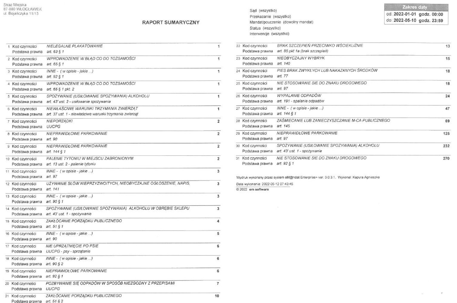 Od Straży Miejskiej Włocławek otrzymaliśmy zestawienie prezentujące za co i ile razy strażnicy wypisywali mandaty karne w omawianym okresie. Pojedyncze przypadki to nielegalne plakatowanie, wprowadzenie w błąd co do tożsamości, czy niewłaściwe warunki trzymania zwierząt. Na drugim biegunie znajduje się spożywanie (usiłowanie spożycia) alkoholu – 232 mandaty, nie stosowanie się do znaku drogowego – 270.