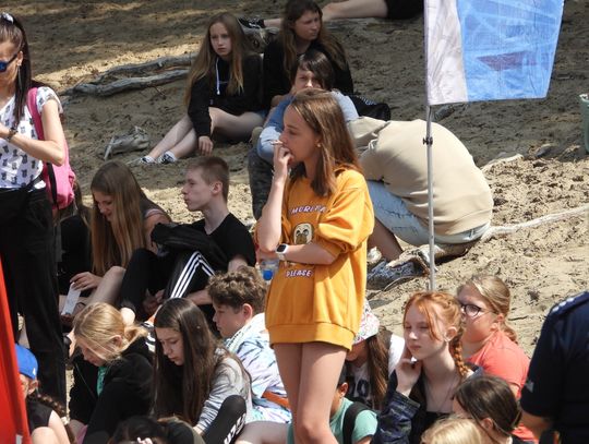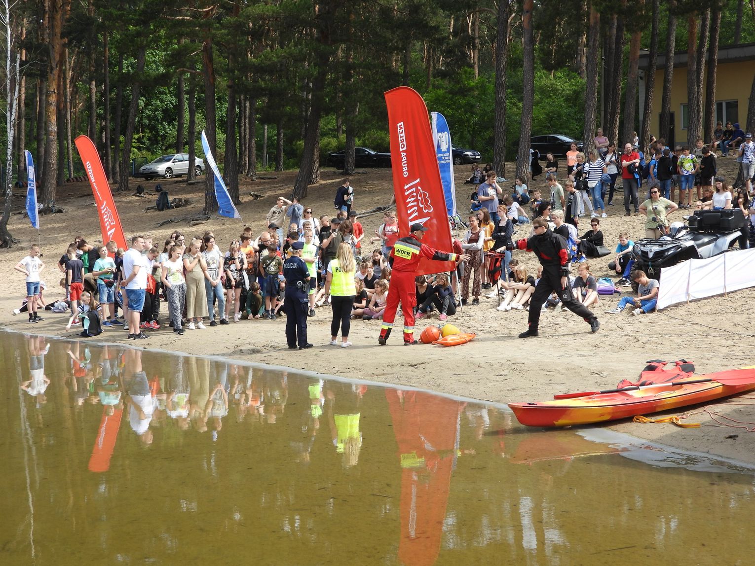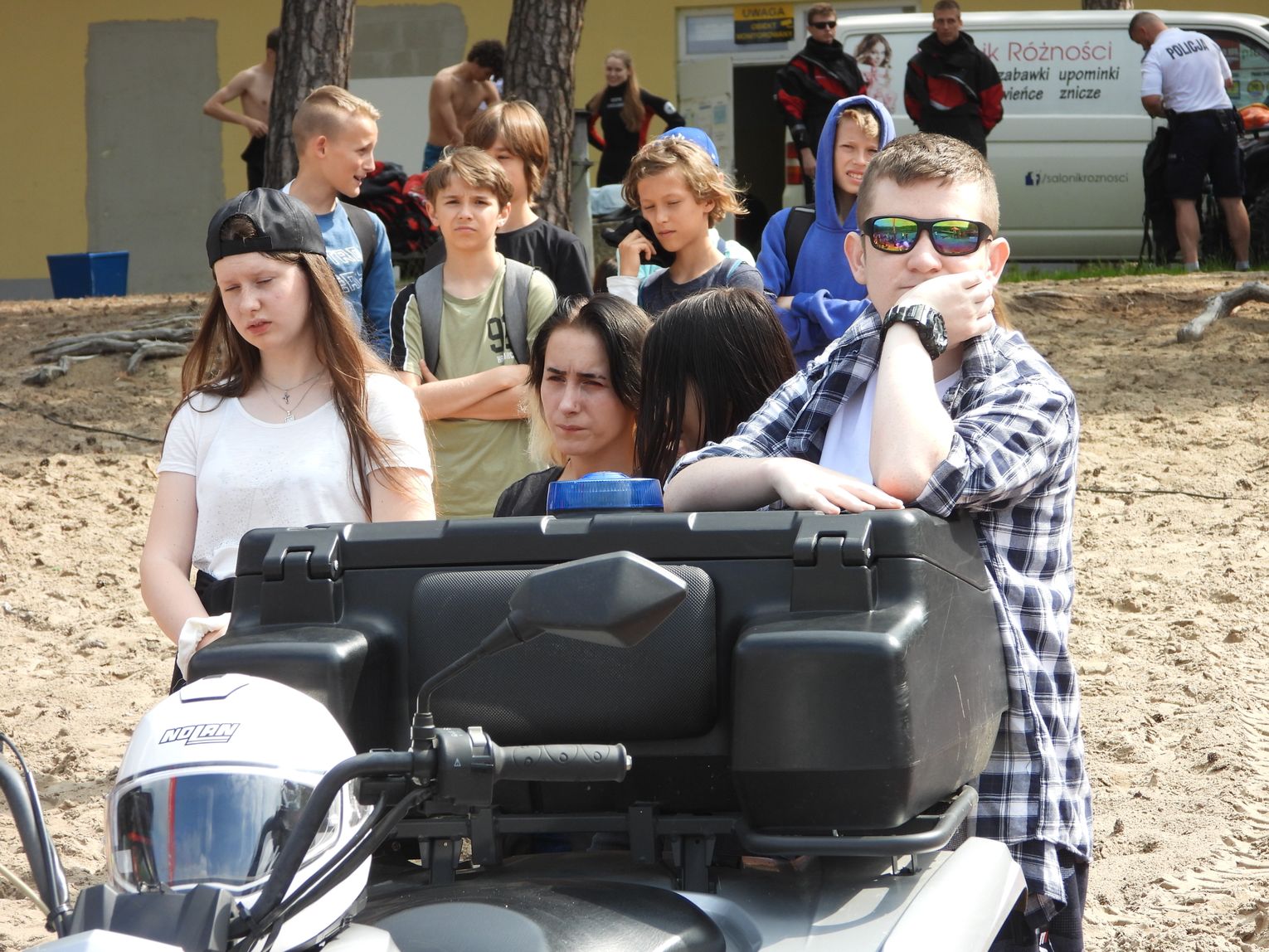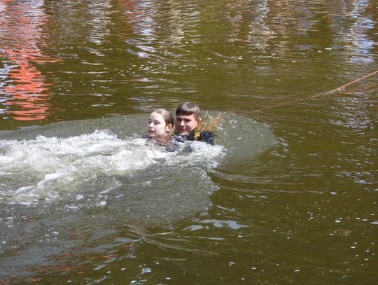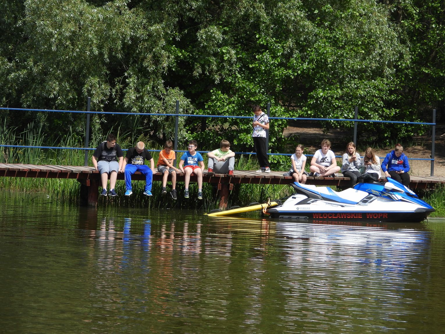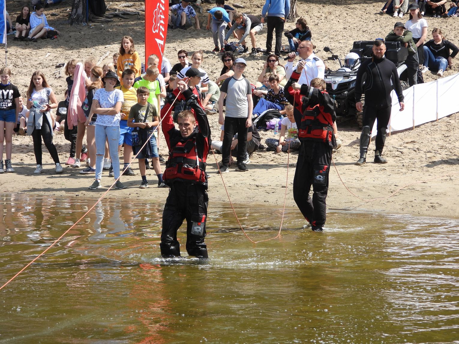 Uczniom najpierw przedstawiono wiedzę teoretyczną. Po kilkunastu minutach odbyły się pokazy praktyczne. WOPR przedstawił kilka sposobów podejmowania z wody topiących się ludzi. Największe zainteresowanie wzbudziło użycie skutera wodnego. Jeden z funkcjonariuszy wcielił się w rolę osoby nietrzeźwej. Biegał po plaży z pustą butelką, a jego rajd zakończył się skokiem do jeziora. Mężczyzna zaczął się topić, ale z pomocą przyszedł mu funkcjonariusz policji. Ostatecznie "nietrzeźwy" został uratowany, a na brzegu założono mu kajdanki.