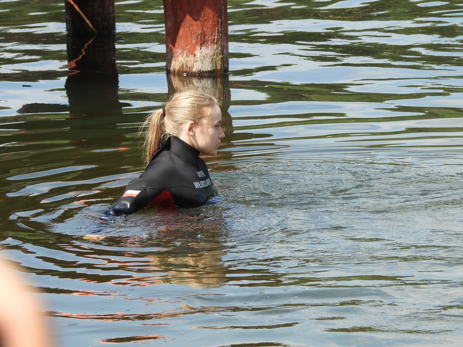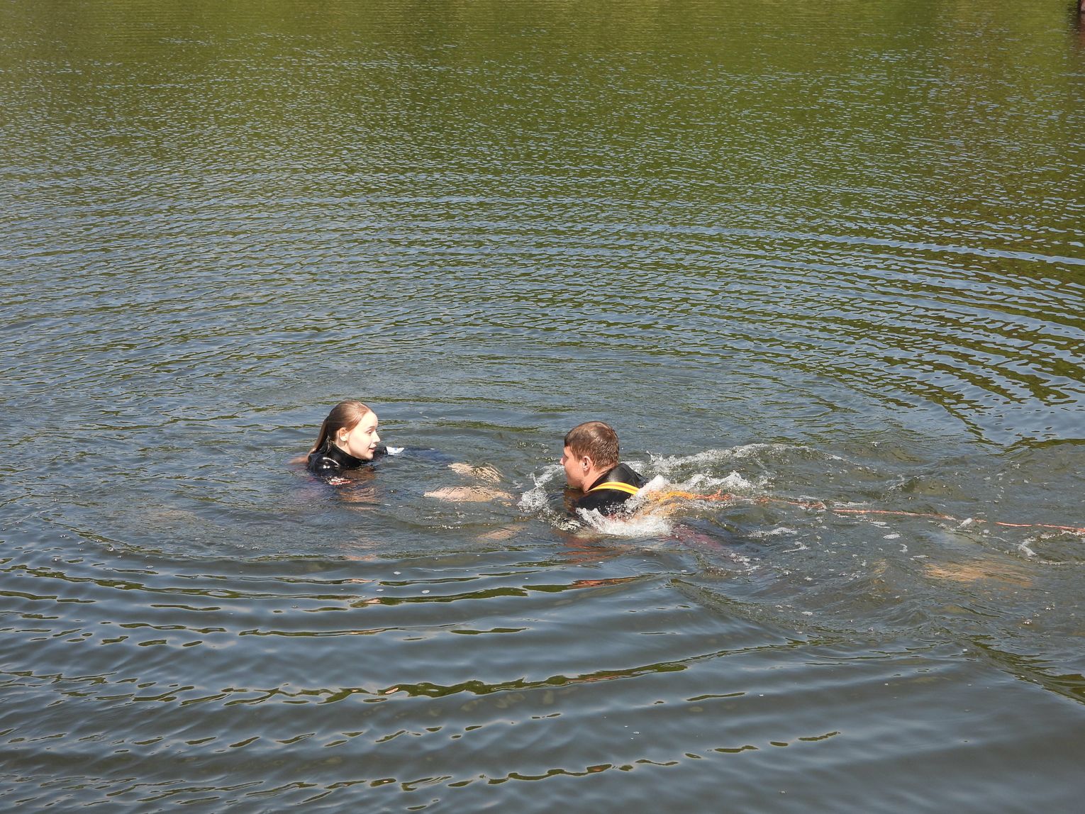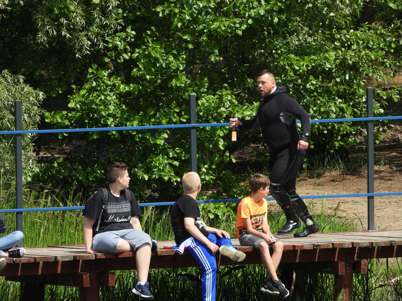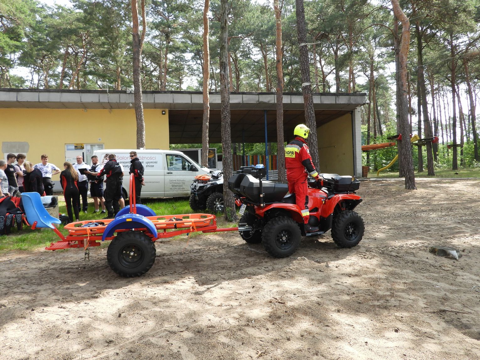 Uczniom najpierw przedstawiono wiedzę teoretyczną. Po kilkunastu minutach odbyły się pokazy praktyczne. WOPR przedstawił kilka sposobów podejmowania z wody topiących się ludzi. Największe zainteresowanie wzbudziło użycie skutera wodnego. Jeden z funkcjonariuszy wcielił się w rolę osoby nietrzeźwej. Biegał po plaży z pustą butelką, a jego rajd zakończył się skokiem do jeziora. Mężczyzna zaczął się topić, ale z pomocą przyszedł mu funkcjonariusz policji. Ostatecznie "nietrzeźwy" został uratowany, a na brzegu założono mu kajdanki.