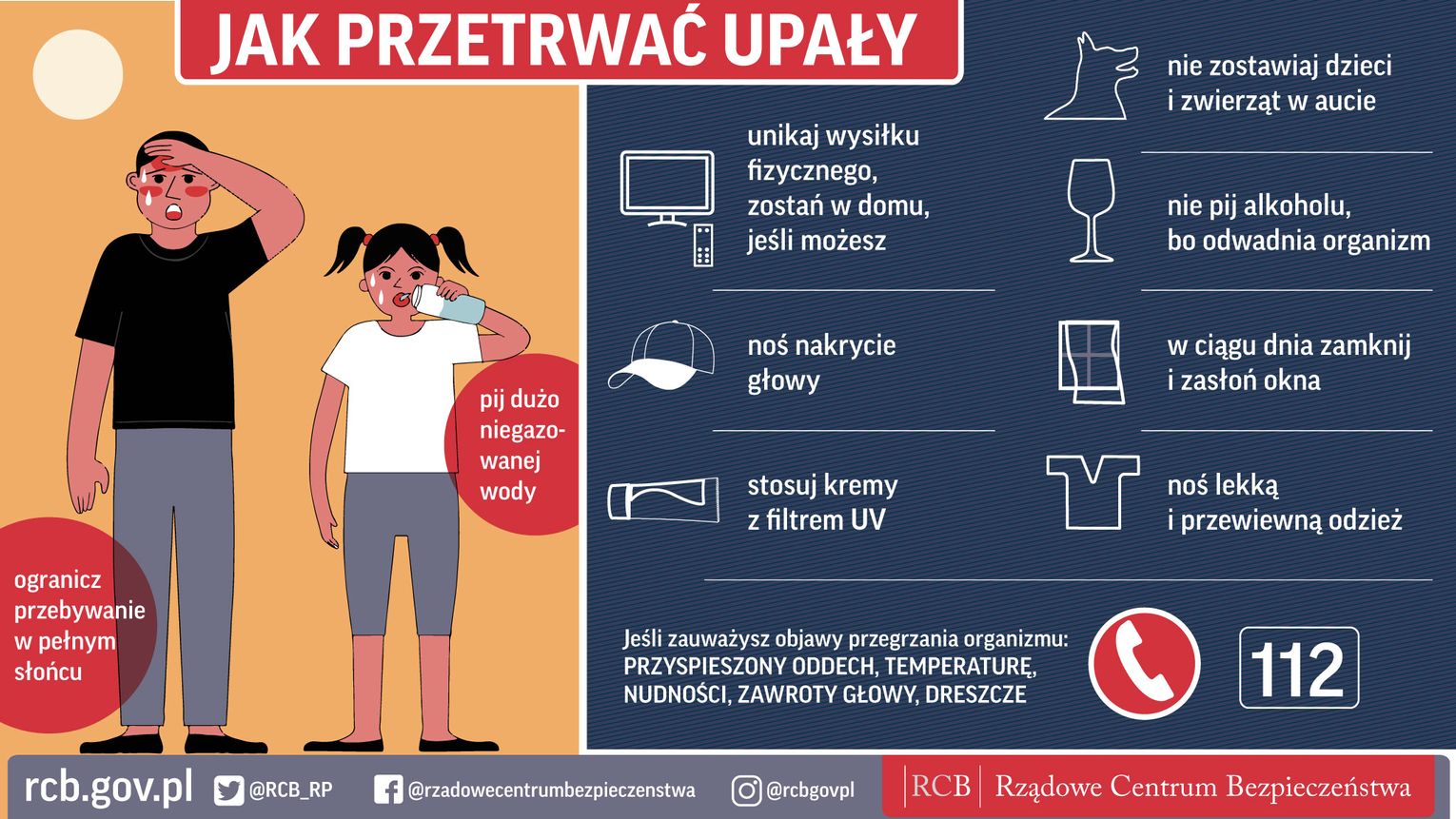 Jak przetrwać upały? Trzeba pić dużo niegazowanej wody, unikać wychodzenia na zewnątrz w najgorętszej porze dnia, unikać forsownego wysiłku fizycznego, korzystać z chłodnych pryszniców. Pamiętajmy, aby w upalne dni nie zostawiać w samochodzie dzieci, zwierząt i materiałów łatwopalnych.
