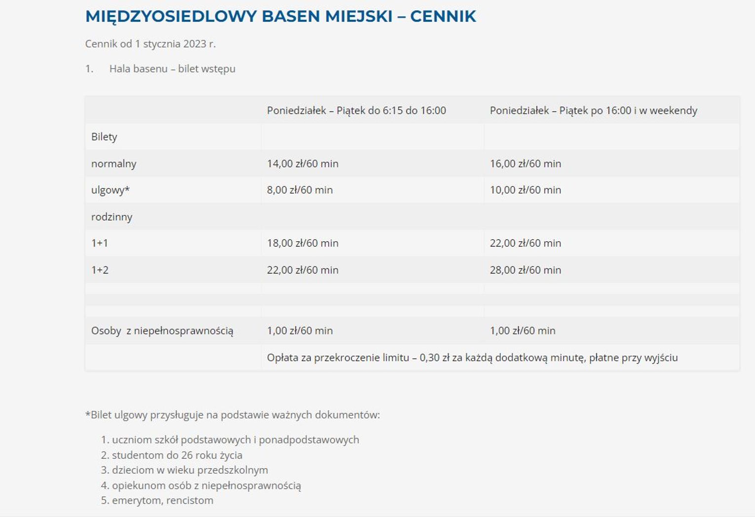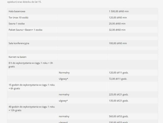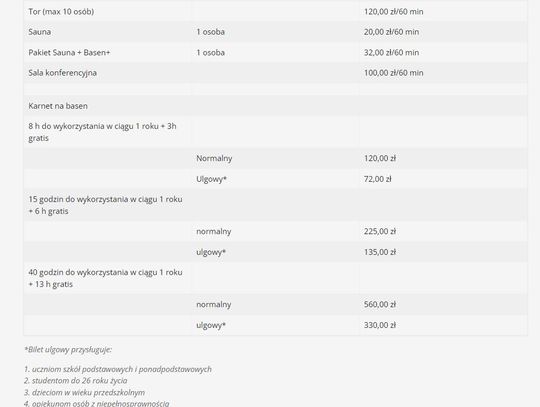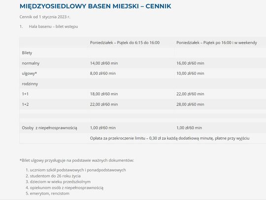 Ośrodek Sportu i Rekreacji we Włocławku poinformował o zmianach cen dla klientów obowiązujących od nowego roku. Od 2023 roku na Międzyosiedlowym Basenie Miejskim za 60 minut korzystania z basenu zapłacimy 14 zł. Osoby upoważnione do ulg - 8 zł. Drożej wyniesie bilet wstępu od poniedziałku do piątku po godz. 16.00 i w weekendy. Wówczas koszt biletu normalnego wyniesie 16 zł, ulgowego 10 zł. Osoby niepełnosprawne zapłacą złotówkę za godzinę. Za przekroczenie czasu 60 minut 0.30 zł za każdą dodatkowa minutę - płatne przy wyjściu. Godzinne korzystanie z sauny - 20 zł.