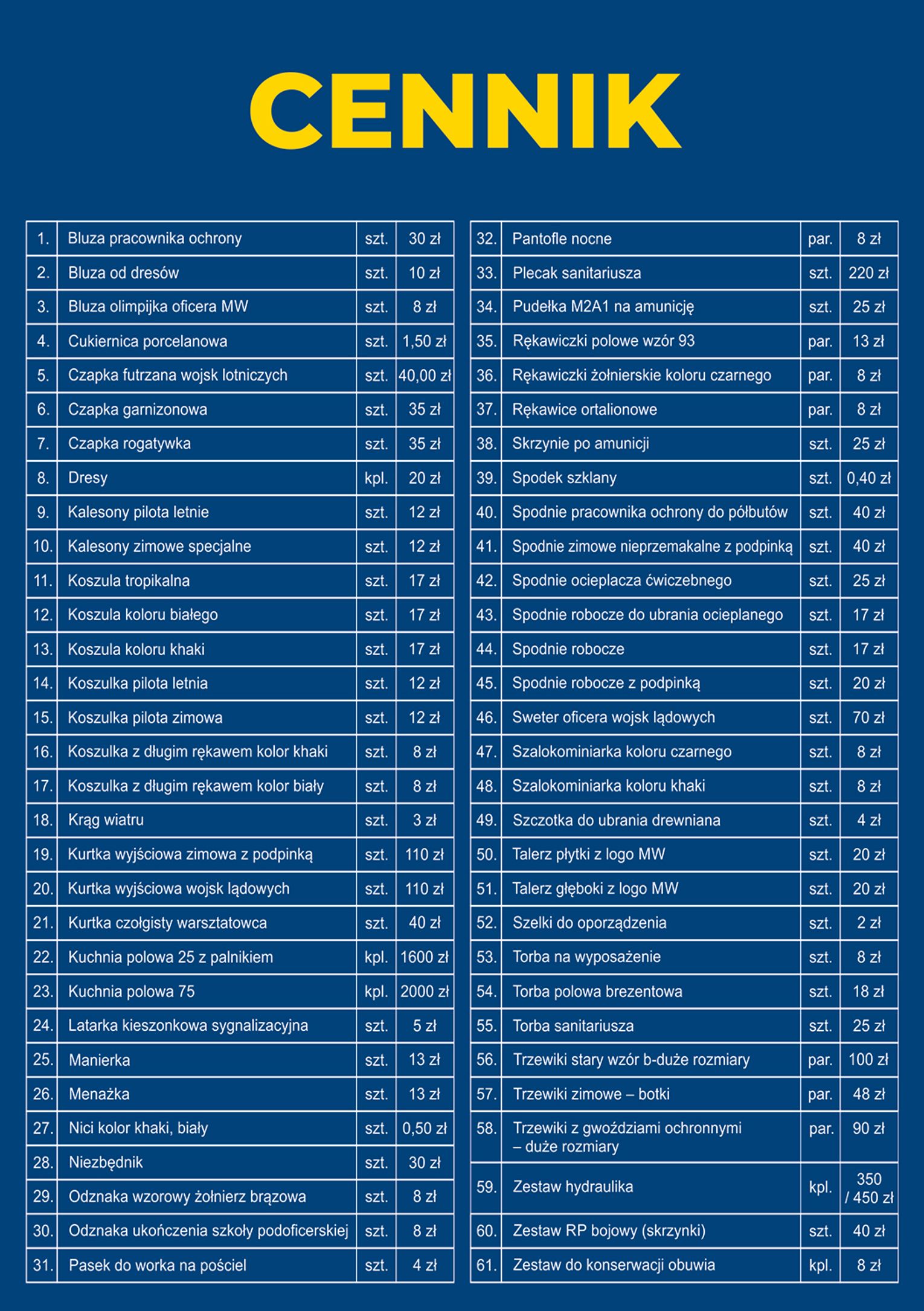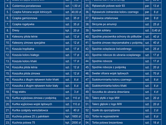 W wojskowym magazynie, na co dzień dostępnym tylko dla pracowników bydgoskiego oddziału Agencji, można będzie znaleźć odzież idealną na zbliżającą się zimę, m.in.: koszulę pilota zimową (12 zł), bluzę olimpijską oficera MW (8 zł), dresy (20 zł), kurtkę zimową z podpinką (110 zł), spodnie zimowe nieprzemakalne z podpinką (40 zł), sweter oficera wojsk lądowych (70 zł), spodnie ocieplacza ćwiczebnego (25 zł), trzewiki zimowe – botki (48 zł), czapkę futrzaną wojsk lotniczych (40 zł), szalokominiarkę (8 zł) kalesony zimowe (12 zł). W atrakcyjnych cenach będzie można nabyć również manierki (13 zł), menażki (13 zł), latarki kieszonkowe (5 zł), niezbędniki (30 zł), torby – sanitariusza (25 zł), na wyposażenie (8 zł), polowe prezentowe (18 zł), czy zestawy: zestaw RP bojowy (40 zł), zestaw hydraulika (350 – 400 zł), czy zestaw do konserwacji obuwia (8zł). Ponadto, za niewielkie pieniądze zakupić będzie można nici (0,50 zł), cukiernice porcelanowe (1,50 zł), szelki do oporządzenia (2 zł).